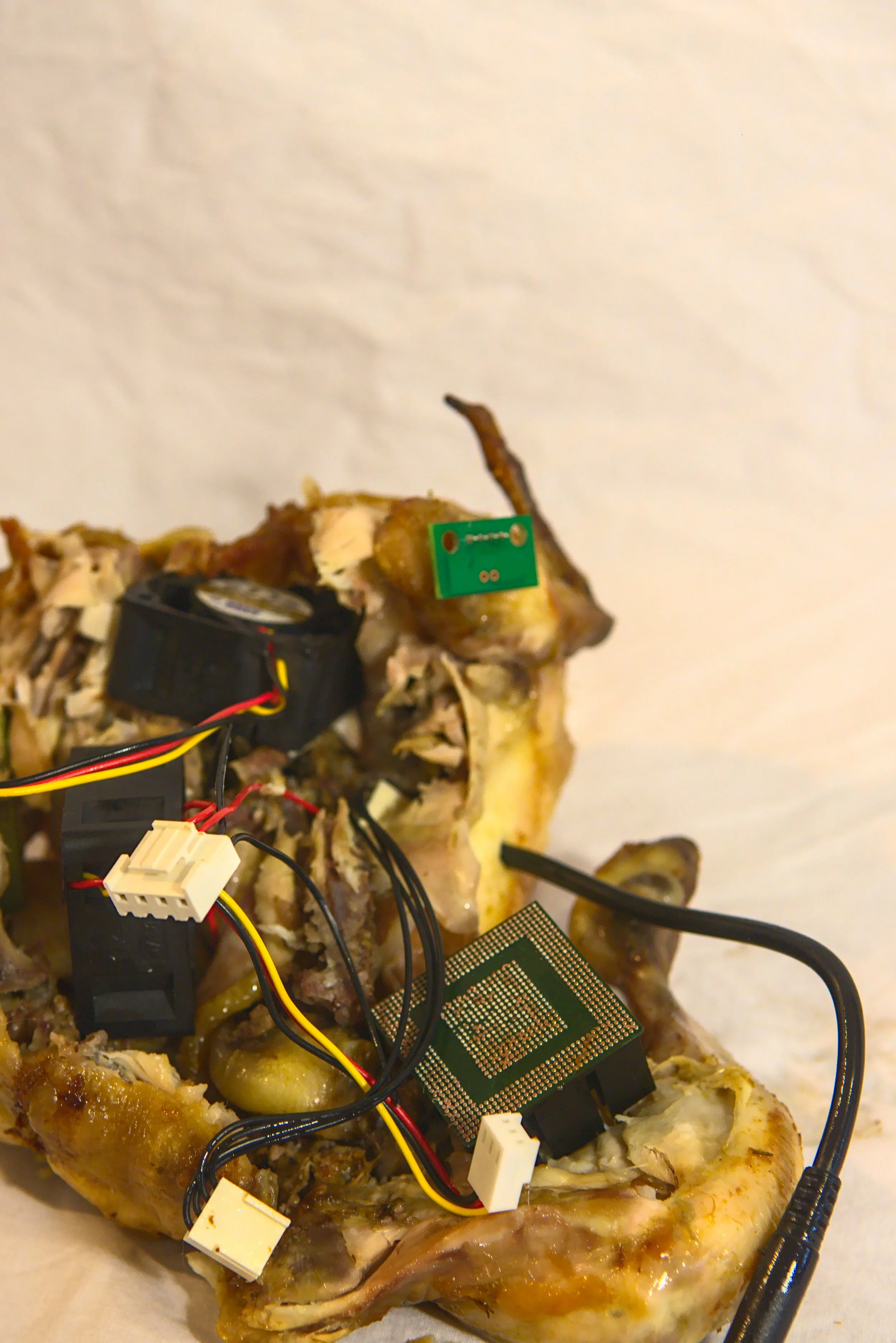Des nourritures nouvelles, spirituelles, cyborgs, des intrications comme si fibres optiques et carpiques avaient oublié leurs différences. Comme si les aliments électroniques avaient enfin l’âge de rejoindre leurs aînés sur la table des symboles de l’abondance.